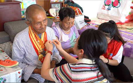 今年是中国共产主义青年团成立100周年,也是党的二十大召开的伟大时刻。为追寻红色印记,在实践学习中传承红色基因,学院“许愿计划”实践团跨越千里前往宁夏盐池县革命老区,参观了盐池县革命历史纪念园,重温了当年红军奋勇杀敌的峥嵘岁月。实践团成员前往盐池县青山乡尖山湾村看望曾参加抗日战争、抗美援朝战争的老兵—93岁的老党员侯兴芳同志及爱人李玉兰同志,在送去慰问的同时,听革命老兵讲述初心故事。