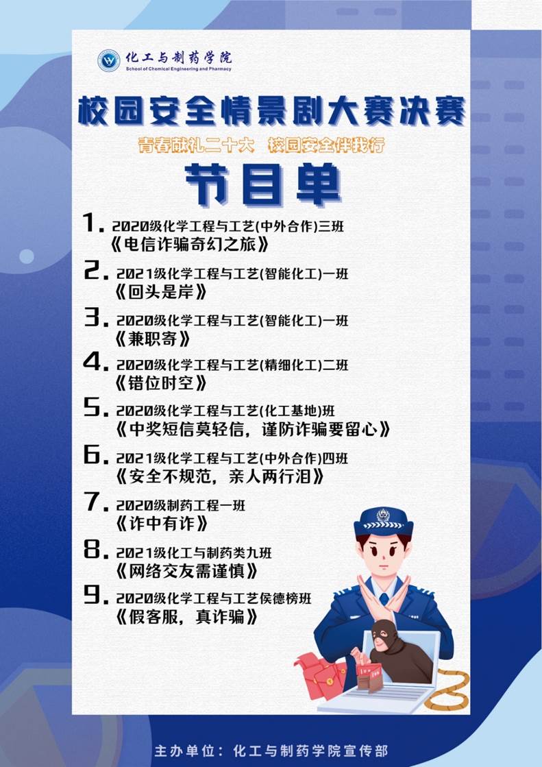 于6月8日在化工大楼610报告厅举办 “青春献礼二十大 校园安全伴我行”校园安全教育情景剧决赛。