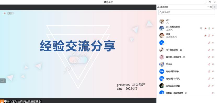 于5月2日举行“榜样力量 青春引航”优秀学子经验分享会,线下分享和线上观看同时进行。本次优秀学子经验分享会邀请2019级药剂学硕士研究生周金韵萍和本科2018级药卓班学生兰鑫担任主讲人,学院学生代表参加了此次活动。