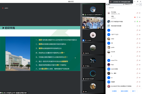 联合浙江华海药业股份有限公司等九家企业开展线上宣讲会,结合线下集中观看、线上自主投递的方式,推动学院2022届毕业生就业工作稳步前进。学校招生与就业工作处处长刘念、学院党委副书记周丹出席了本次宣讲会。