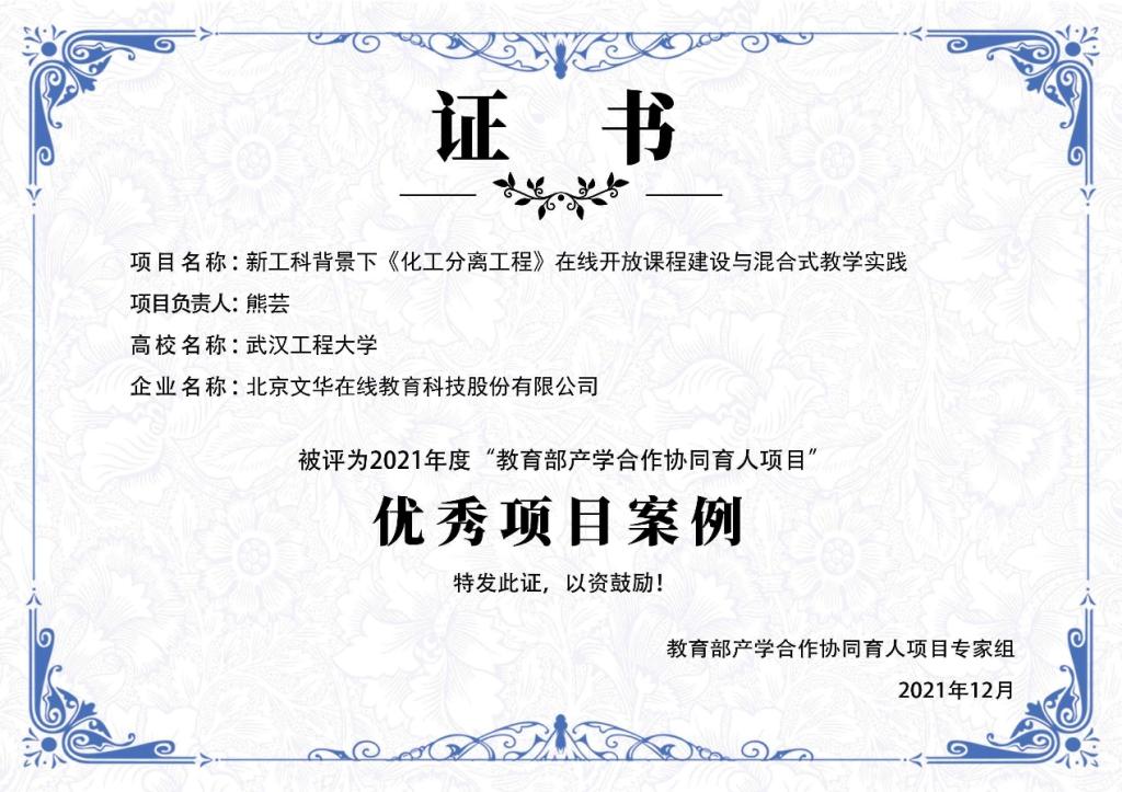 熊芸博士主持完成的2018年第二批教育部产学合作协同育人项目“新工科背景下《化工分离工程》在线开放课程建设与混合式教学实践”获评2021年度教育部产学合作协同育人项目“新工科、新医科、新农科、新文科建设类”优秀项目案例。